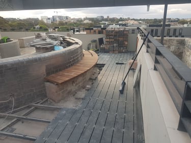 This project in Redfern, consisted of multiple decks and floating benches. Although low level, there was enough airflow for a timber substructure and composite boards.