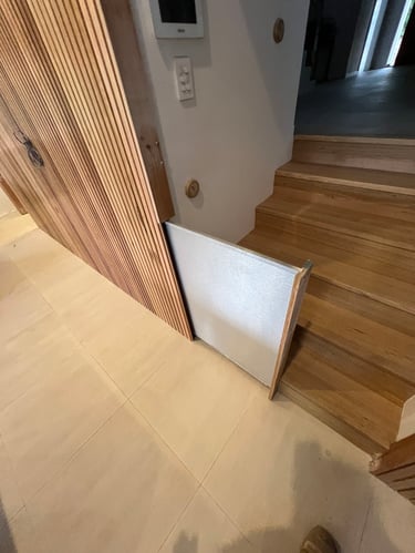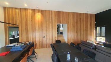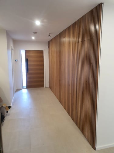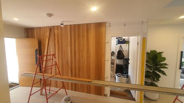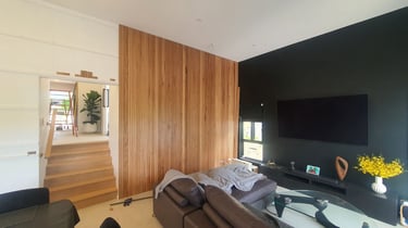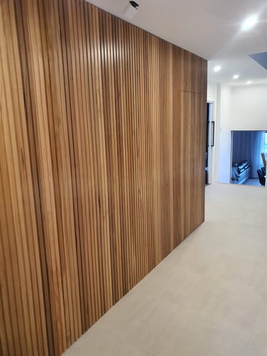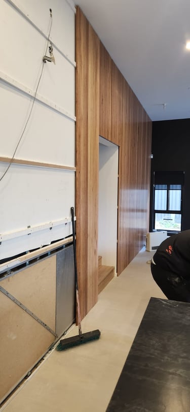 Using product sourced from Modinex, we installed single lengths of blackbutt to some of the walls in this new build home. Two of the walls required hidden doors, one of which was extremely challenging. The job looks fantastic and is by far the nicest feature wall we have done.